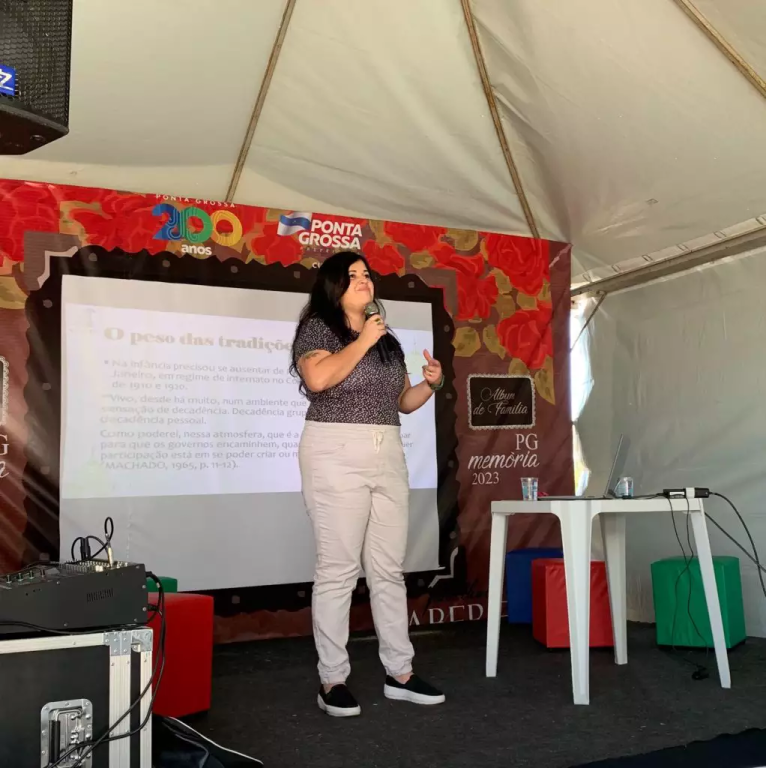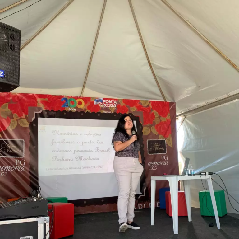 A primeira palestra do dia foi da pesquisadora Letícia Leal, que abordou “Memórias e Relações Familiares a partir dos Cadernos do Historiador Pontagrossense Brasil Pinheiro Machado”. Ao falar do historiador e político nascido em Ponta Grossa no ano de 1907, a historiadora apresenta como o conteúdo que ele escreve sobre suas vivências retrata a cidade. Ela destaca trechos retirados dos registros de memória de Pinheiro Machado entre 1964 e 1973, com enfoque na influência que as tradições familiares tinham em sua vida pessoal, gerando preocupações diante da saída dele da cidade.